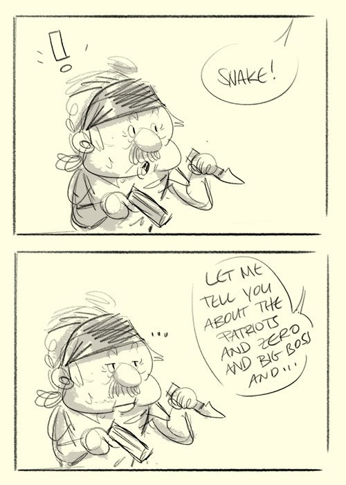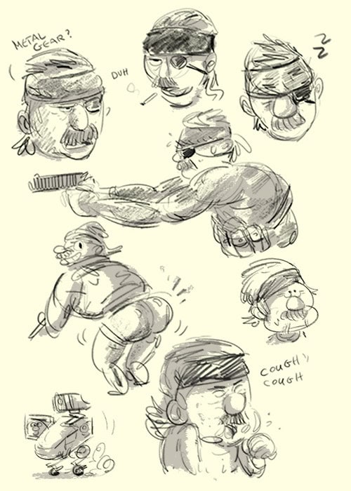 Been watching a playthrough of Metal Gear 4 while cleaning up Storyboards and drew some Old Snake doodles during breaks. He is really old you guys!